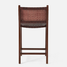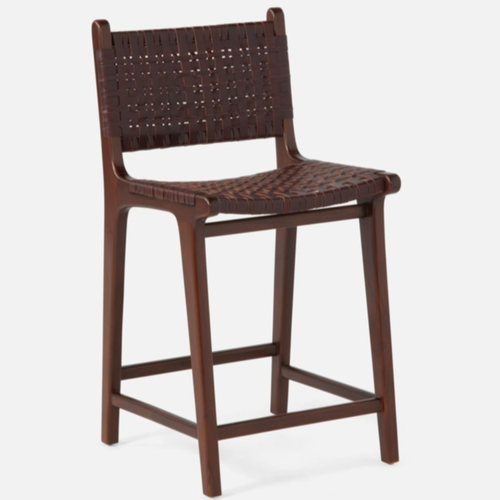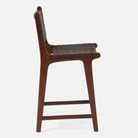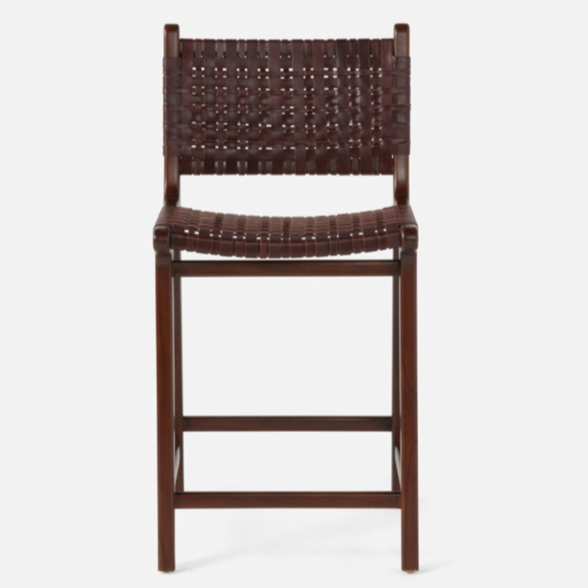 refined and sturdy, this stool features a woven, full-grain chestnut leather seat and backrest paired with a dark-stained teak frame. this versatile stool offers a luxurious seating experience that complements any decor style.
