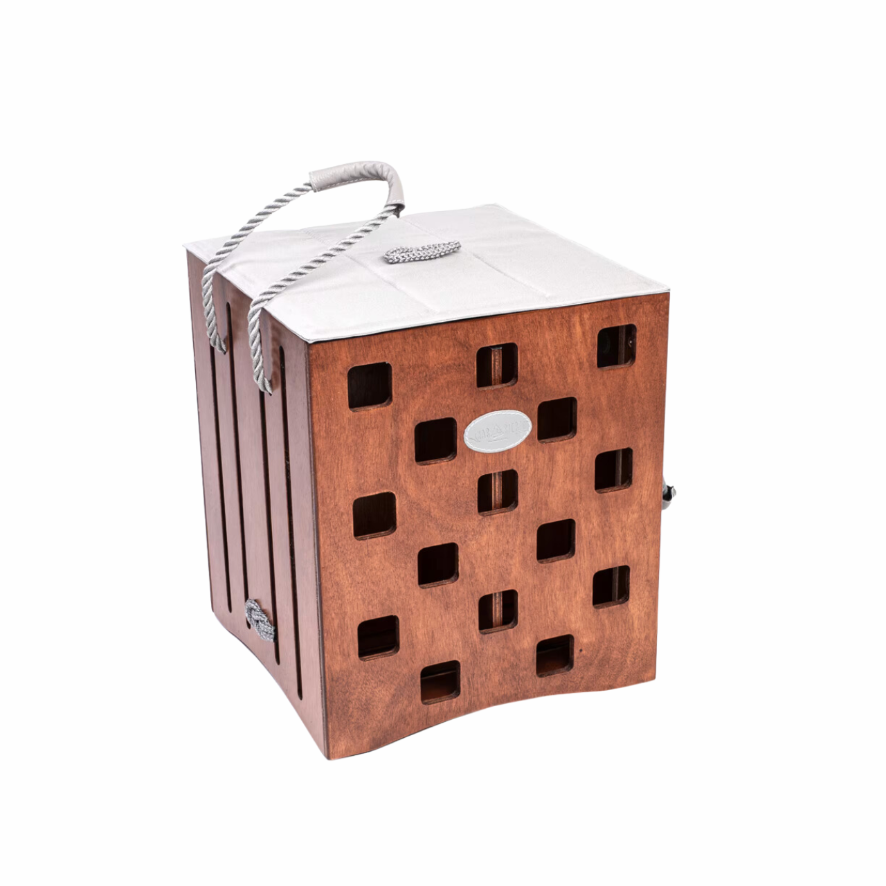 this is the original marricreo storage box in a size medium. it boasts gray details in the eco-leather inserts and rope handles, and a loop for the seat cushion that harmoniously contrast with the warm natural finish of the wood. high like a chair, it can also suit as elegant stool either empty or filled with clothes or towels that can be neatly stored thanks to two inner dividers. handmade in italy