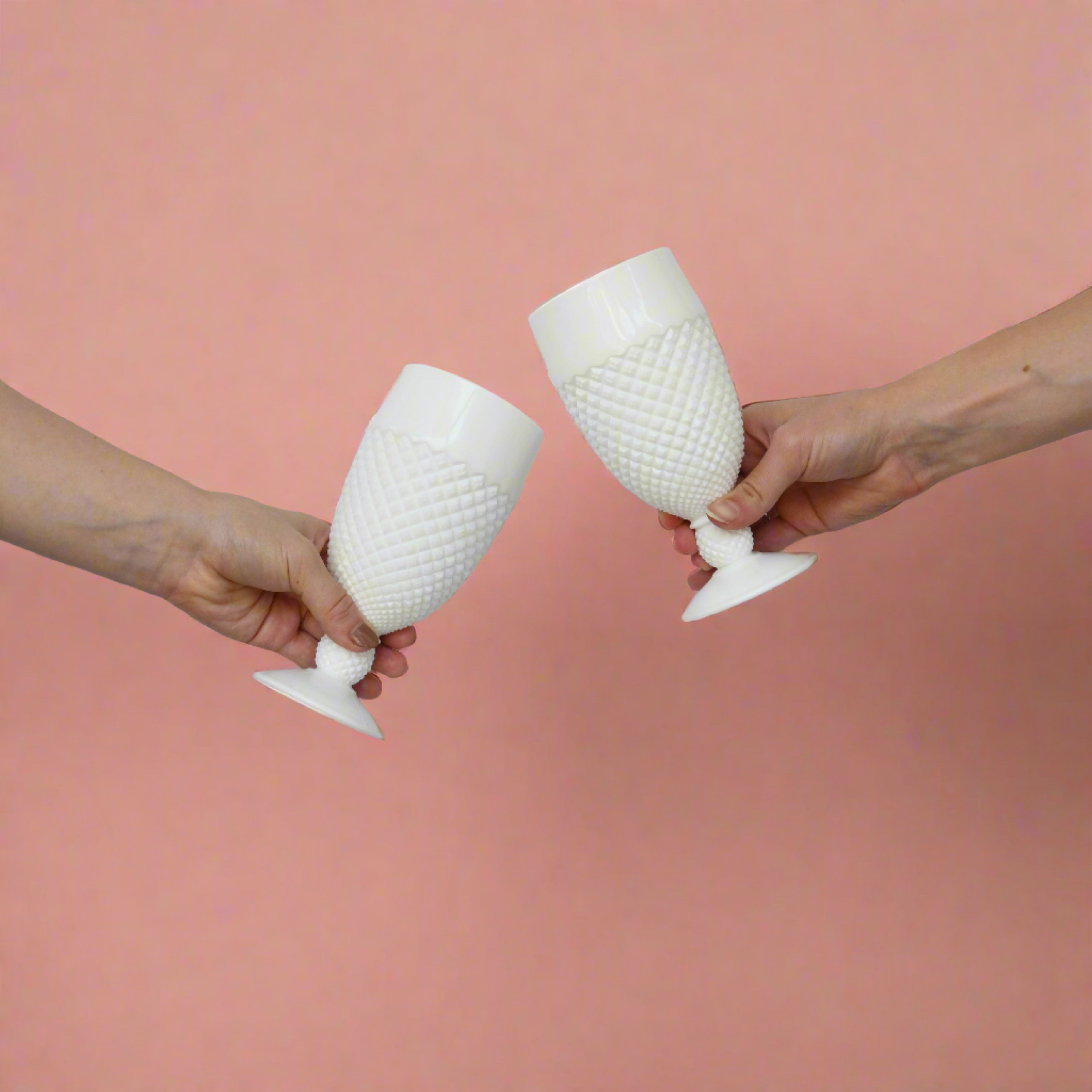 elevate your dining experience with the mosser addison goblet in milk. handmade in the united states, this exquisite glass goblet exudes charm with its textured design. create a captivating table setting by pairing it with other pieces from mosser glass or let it shine on its own amidst off-white linens and simple flatware. embrace elegance with every sip.